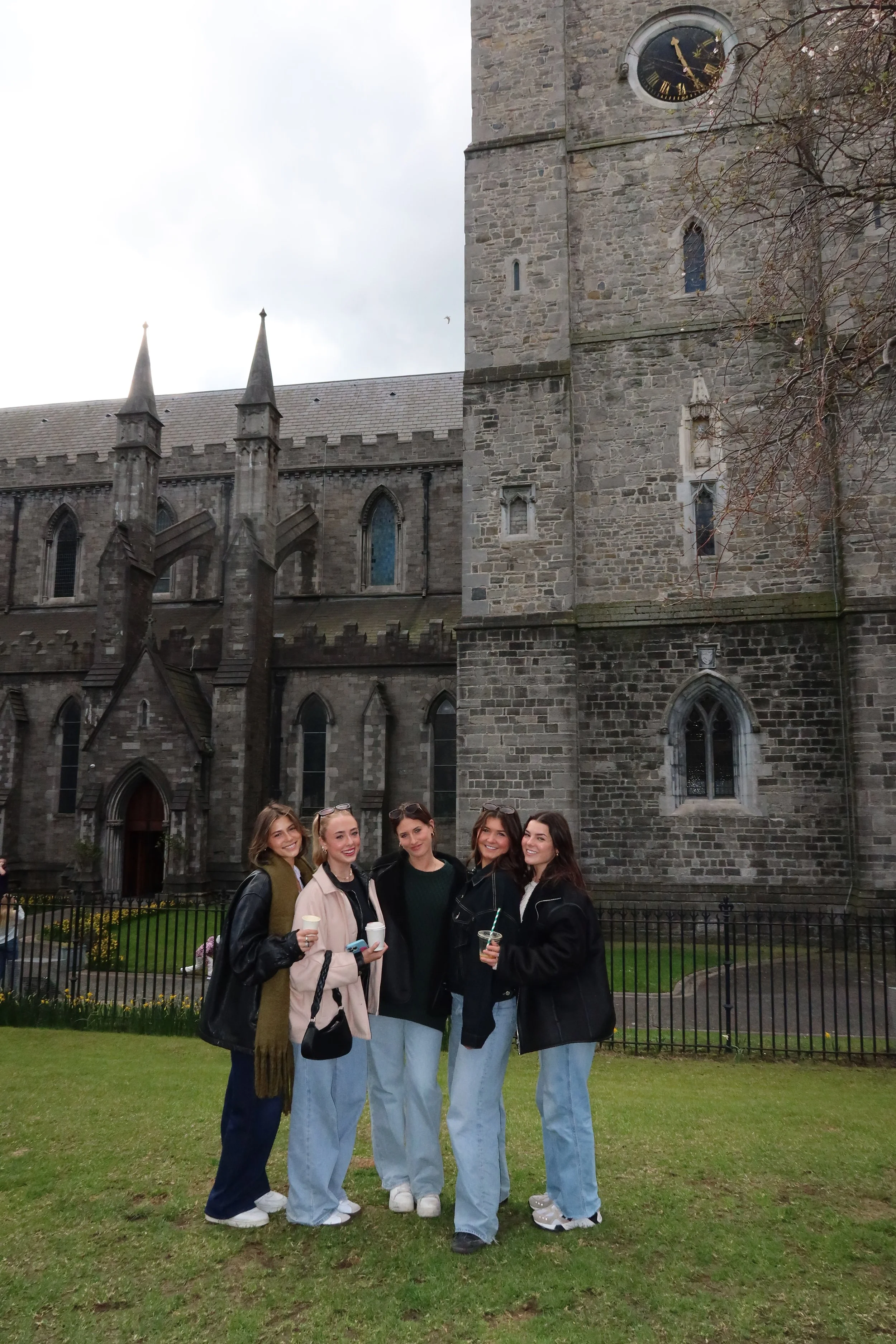 Our friends Katie and Liv flew into Dublin on Saturday morning and arrived at the hotel around 9:30. After catching up, we got ready and grabbed a quick coffee at Soren & Son. In addition to a delicious drink, I ordered a unique-looking sausage roll which ended up being so tasty... From there, we headed in the direction of St. Patrick’s Cathedral. The church was absolutely stunning, but we didn't want to pay for a ticket to the church, so we just peeked our heads inside. Outside the cathedral, there was a little St. Patrick’s and sustainability-themed market featuring many different vendors. While abroad, my goal is to find a special gift for each of my family members. At this market, I bought a delicate emerald ring for my sister, who has a May birthday… After the market, we met up with Morgan’s parents to shop more before getting lunch. After lunch, we stopped at Carol’s which is the place for getting all things St. Patrick's themed at a very reasonable cost. Here, we found a couple of fun knickknacks and St. Patrick's themed necklaces.