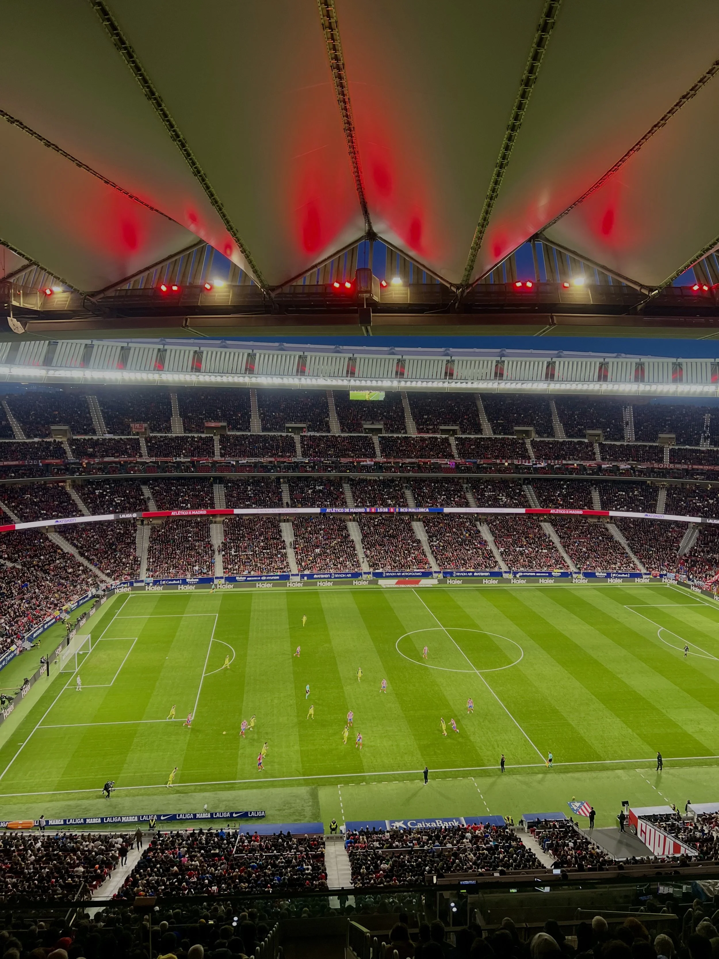 Next, we sprinted to the gates of Riyadh Air Metropolitano to find our seats. This sold-out stadium was shaking with pride for their team. We bought tickets on the top deck for 55 euros to save money but spent around 20-30 euros on drinks. Our friends purchased box seats with unlimited food and drink for 80 euros, which was more cost-effective (who knew). After the game, some friends went back to the hostel while Morgan and I stopped at Mercado de San Miguel for a quick sweet before bed.